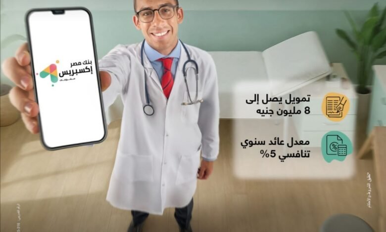 بنك مصر يطلق تمويل إكسبريس للأطباء حتى 8 مليون جنيه لدعم القطاع الطبي بسعر عائد تنافسي 5% ضمن مبادرة البنك المركزي المصري