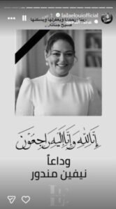 ونشر شريف صورة لها، وعلق: «لا إله الا الله.. الصديقة الطيبة الجميلة نيڤين مندور في ذمة الله.. الله يرحمك ويحسن إليكي».